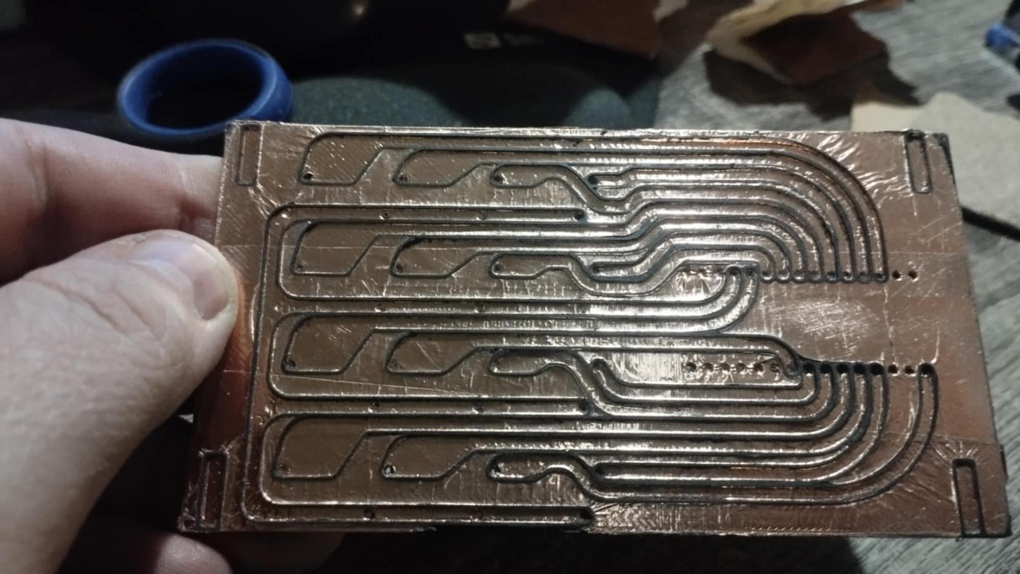 - Press the companion mold on top — it pushes the copper into the recessed traces.